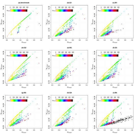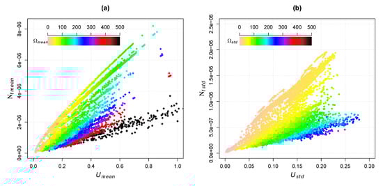 Superposition of scatter plots of the nine vs. U cases. (a) Time-averaged and (b) time-averaged-variation. Same notation as for Figure 12.