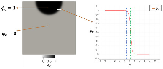 This regularization creates a finite region, where varies from 0 to 1 controlled by the thickness parameter, , which corresponds to the half of the interface thickness. The thickness parameter, , is determined by the element size in the mesh and a finer mesh implies a smaller value of . In this way, at the interface, results in whereas is a diffuse distribution from 0 to 1 along the distance of . After a simple initialization, the result of is shown in Figure 1. In order to prevent numerical issues, the value of the thickness parameter should be slightly larger than the element size. In simpler words, sufficiently many elements need to be used within the transition region of length . As the mesh becomes finer, the thickness parameter may be decreased proportionally to enhance the accuracy of the interface. In simpler words, the accuracy is mesh-dependent and we aim for a monotonous convergence in in order to ensure the reliability of the implementation.