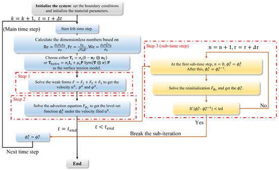 The algorithm scheme is illustrated in Figure 2. The process involves two iterations, both pertaining to the time step. In the first iteration, we solve the balance equations, and in the second iteration, we solve the advection equation based on the velocity field results. Subsequently, in the third step, which is a sub-iteration at each time step, we carry out the reinitialization process.
