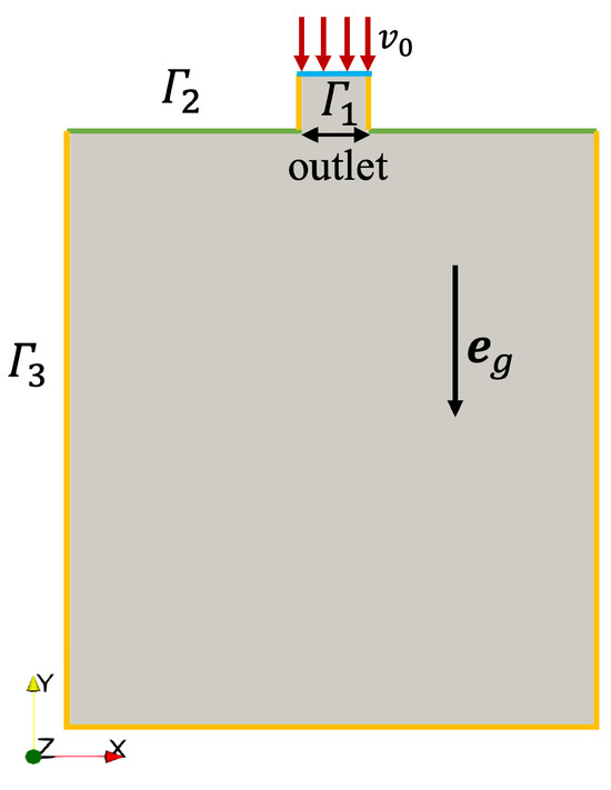 In this paper, we establish a 2D finite element model based on the free-falling jet subjected to gravity and validate the accuracy of the proposed model for interface simulation by comparing it with experimental results. In Figure 3 boundary regions are separated by marking them in different colors. The fluid enters across the blue boundary, passes through a pipe (a dimensionless geometric parameter), and falls freely under the influence of gravity (with an initial velocity given at the blue boundary, inlet). The no-slip boundary condition is set on yellow boundaries, while the pressure is set to 0 on the green boundary, outlet. Since denotes fluid, we emphasize that for simulating the continuous inflow of fluid, we set the condition of on the blue boundary for all times. The boundary conditions are summarized as follows: