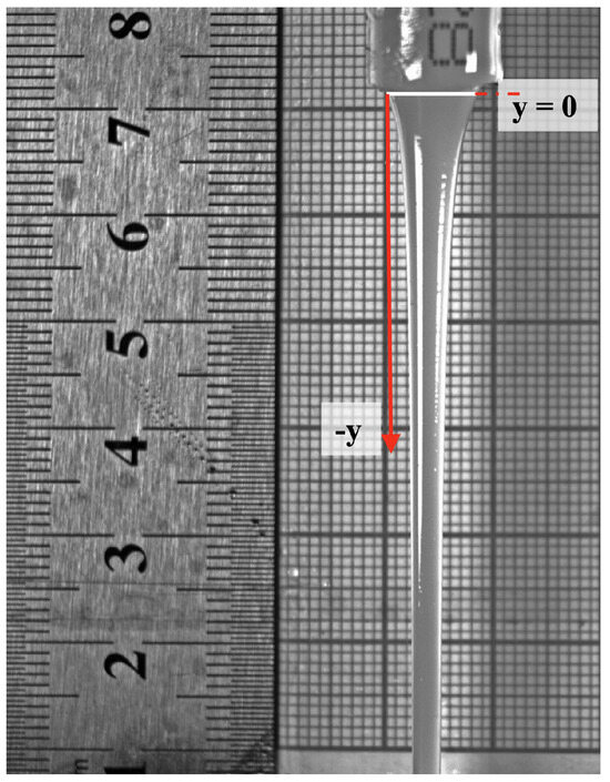 In order to process the results shown in Figure 5, images of the stable liquid jet were captured. Several points were then selected along the flow direction, and the diameter of the liquid jet was calculated and recorded at each position using the scale provided on the left side of Figure 5 and the background grid. For each stable jet, 4–5 sets of data were taken. The remaining data were averaged to obtain the surface profile result for the current jet.