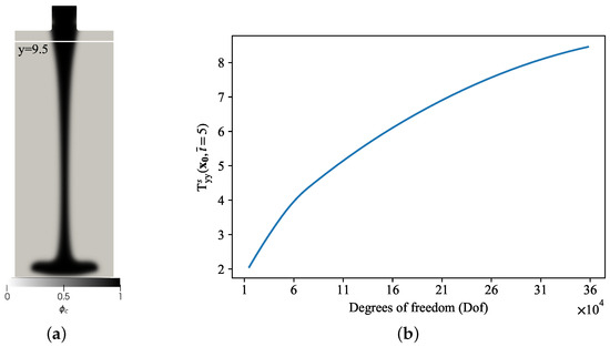 Initially we conduct a convergence test on the results of the surface tension model. Figure 6b presents the normal stress, , as it results from surface tension tensor, , computed by different Degrees Of Freedom (DOFs). In FEniCS, the Degrees Of Freedom (DOFs) are determined based on the mixed variable space that contains all the unknowns in the fluid governing equations, specifically the velocity and pressure. The total number of DOFs corresponds to the sum of the independent variables required to describe the solution, accounting for all components of velocity and the pressure across the entire computational domain. We select the extreme value of at the boundary interface where when the initial part of the jet stream is stable at , as seen in Figure 6a. The component of the surface tension tensor has been selected for convergence results. In the level set method, the transition region, representing the interface, becomes narrower as the mesh is refined, leading to a more accurate representation of the interface. Since the surface tension is influenced by this transition region (based on Equation (14), Equation (12), Equation (5) and Equation (2)), choosing a representative component like is crucial for assessing convergence. Furthermore, is selected specifically because normal stress generally has larger numerical values in direction.