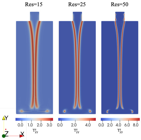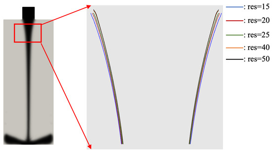 The convergence of is relatively slow and shows that it has strong mesh dependence. We used a uniform triangular mesh, shown in Figure 7, to eliminate the influence of irregular mesh on the results.This phenomenon relies on the surface tension model Equation (14) in this study, based on the level set method. In Equation (2), the choice of thickness parameter, , depends on the size of the element. A finer mesh leads to a smaller value, resulting in a thinner transition interface region. Obviously, with a thinner interface, the actual “interface” is more accurately modeled, and thus, the area, where acts, becomes smaller, see Figure 8. The results of are maintaining a consistent interface contour as in Figure 9 at different resolutions. As contours at resolutions 40 and 50 are indistinguishable, the system has converged.
