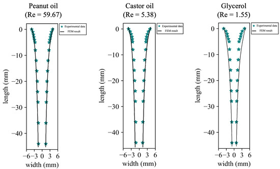The results comparison of Peanut oil, Castor oil, and Glycerol are presented from left to right, respectively, each with their distinct material parameters and Reynolds numbers. The black solid line in each plot represents the contour line of the liquid jet edge interface obtained from finite element numerical simulations, while the asterisk denotes the corresponding experimental result. The mean relative error (MRE) for each case: the MRE for Peanut oil is , for Castor oil is , and for Glycerol is .