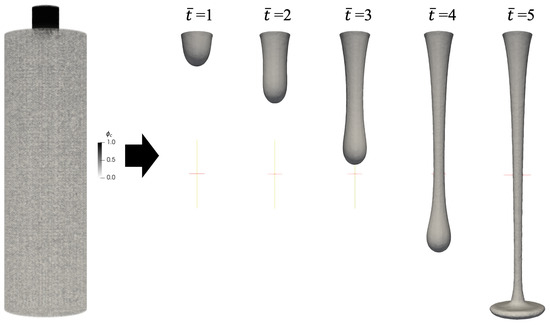 Preprocessing and results in a three-dimensional solution with the same implementation. Left: computational domain, with the fluid region represented in black. Right: at different time instants, results for , representing the surface of the jet.