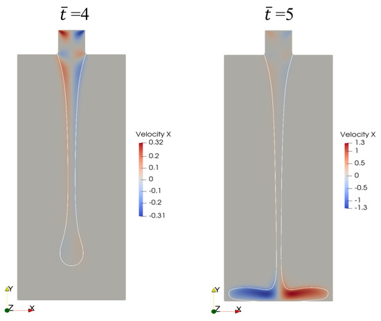 Finally, we investigate the impact of the surface tension term and the viscous friction term on the results within the applied surface hydrodynamics theory. From the conclusions, it is observed that these two terms exhibit a certain level of independence in their influence on the numerical computation results. From Figure 14b, we observe the influence of the viscous friction component in the new surface tension model on the initial contraction of the jet. In addition, Figure 16 also demonstrates the distribution of the x-direction velocity component (horizontal velocity component) in the initial contraction part. This solution indicates that the velocity gradient component in the selected adhesive surface hydrodynamics model is worthy of consideration. The ability to control and understand these effects is crucial for predicting and manipulating the behavior of fluid flows in a variety of applications such as solder ball jetting, 3D-printing, and ink-jet printing [67,68,69].