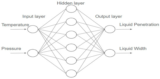 In this paper, the sigmoid function is employed for all hidden layers and linear for the output layer, as it exhibits a satisfactory performance in terms of prediction. The coefficient of determination and mean square error are taken as a valuable indicator of how well the input variables (injection pressure and fuel temperature) in our model explain the variations in the dependent variables, which is spray tip penetration.