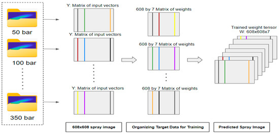In this study, the regression model for spray images of size (M × N) was trained using temperature and pressure as input vectors, and the associated PLV data vector as the output. This study focuses on predicting the behavior of cold spray across a range of pressures and at various times. For each temperature, the ANN is trained using input tables paired with a range of injection pressures (50 bar to 350 bar). For the target, we organize the PLV data into 608 tables, each with dimensions of 608 × 7. We construct each table by extracting the first column from each set of PLV data images and placing it into the first of these 608 tables. We then proceed with the second column for the second table, and so forth. After assembling these tables, each one is trained individually. Once the ANN training is complete, we employ the reverse process, recompiling the trained columns back into 608 × 608 images. Figure 3 illustrates the schematic of the training algorithm for a spray image.