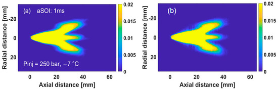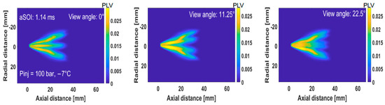 The CT algorithm was used to construct a 3D spray from the liquid volume fraction (LVF) data at three different viewing angles , , and . The reconstruction technique was carried out with MATLAB R2023b using a function like “iradon” for performing the inverse Radon transform and to support GPU computing. The reconstruction procedure was executed on axial sections extending from the nozzle tip to a position z = 60 mm downstream, with a hamming filter parameter value of 0.3. This approach offers detailed information about the distribution and movement of the plumes and better spatial and temporal resolution.