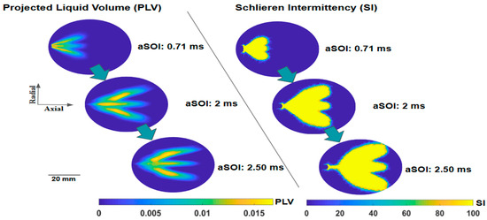 where I and I0 represent the transmitted and incident light intensities, respectively. This level of transmission is suitable for detecting the spray “edge” above the camera noise floor. However, it is important to take into account factors like vapor-phase beam steering. The optical depth, referred to as , is calculated and used to determine the Projected Liquid Volume (PLV). This suggests a spatial integration of the Liquid Volume Fraction (LVF) across the measurement domain, particularly in the cross-stream direction (y), as expressed in the following formula: