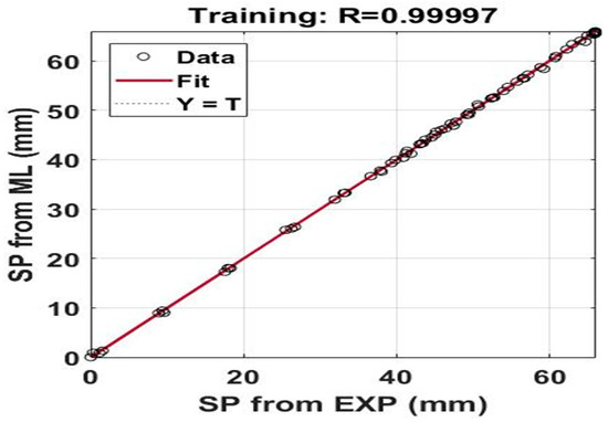 Figure 6 illustrates the temporal evolution of liquid penetration and width over time after the start of injection (aSOI) at these conditions. Solid lines are true values from experiments and symbols are predicted by the machine learning model. In the analysis of liquid penetration and width, the results indicate that the largest deviations between the predicted values by the ANN and the experimental data for both the liquid length and liquid width throughout the injection phase are 3.1 mm with an error of 5.16%, and 0.9 mm with an error of 3.10%, respectively. Similarly, as observed, the developed model accurately predicts the vapor penetration length and vapor width, with small deviations between the experimental and predicted results, showing an error of just 0.7%. Moreover, predicting spray behavior using CFD under various conditions, such as cold starts and hot fuel scenarios, can be challenging due to complex physical processes that include spray dynamics, the effects of temperature and pressure variations, and droplet behavior affected by air entrainment, which increases the turbulence of spray motion [37]. In contrast, the developed machine learning model has shown good agreement with the experimental data in accurately predicting the penetration and width of both liquid and vapor. It is noteworthy that the results indicate a reasonably strong fit for all datasets that include both liquid and vapor spray, with an overall of more than 0.99. Figure 7 illustrates the training accuracy of the ANN model in predicting liquid penetration.