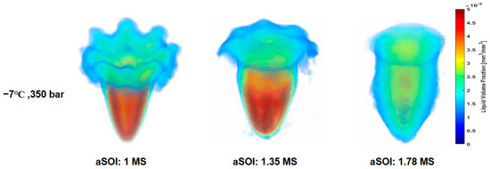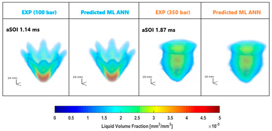 In this study, we used a MATLAB code enhanced for GPU processing to process and reconstruct three-dimensional spray dynamics from ANN-predicted images at different angles of 0°, 11.25°, and 22.5°, as illustrated in Figure 9. It should be noted that the predicted images from these three angles contained slight noise, which affected the clarity and intensity consistency. The source of this issue is the light source in the imaging experimental setup, which does not emit light uniformly but rather radiates over a range of angles due to diffuse radiation. This impacts the accuracy of quantifying the liquid phase in the spray during the experiment and consequently affects the predicted images, which may not accurately reflect the edges of the liquid phase [38]. To mitigate this issue, we applied a noise reduction technique using the ‘imfilter’ function. This algorithm efficiently handled large 608 × 608-pixel image datasets. Through advanced filtering, weighted sums, and symmetry operations, the code assembled cross-sectional planes from these predicted images, which enabled the creation of detailed 3D visualizations from 2D views. The resulting figure shows a 3D spray prediction at 100 bar, −7 °C, and 350 bar, −7 °C, captured at aSOI 1.14 ms and 1.87 ms, respectively. This innovative approach, which combines ANN-based image prediction with advanced 3D spray reconstruction, represents a valuable step in the field of fluid dynamics research. It is important to note that the 3D spray distribution offers quantitative insights into the temporal evolution of both cold and hot fuel spray behaviors, and such LVF data serves to validate and refine CFD models. It was observed that at higher injection pressure and fuel temperature, plume collapsing becomes more prominent. This phenomenon is characterized by a strong plume movement towards the core area. The results, as shown in Figure 10, show a strong agreement between the experimental data and the spray behavior predicted by the model. The model successfully captures the complete plume dynamics, with distinct plumes at low pressure and plumes collapsing at high pressure.