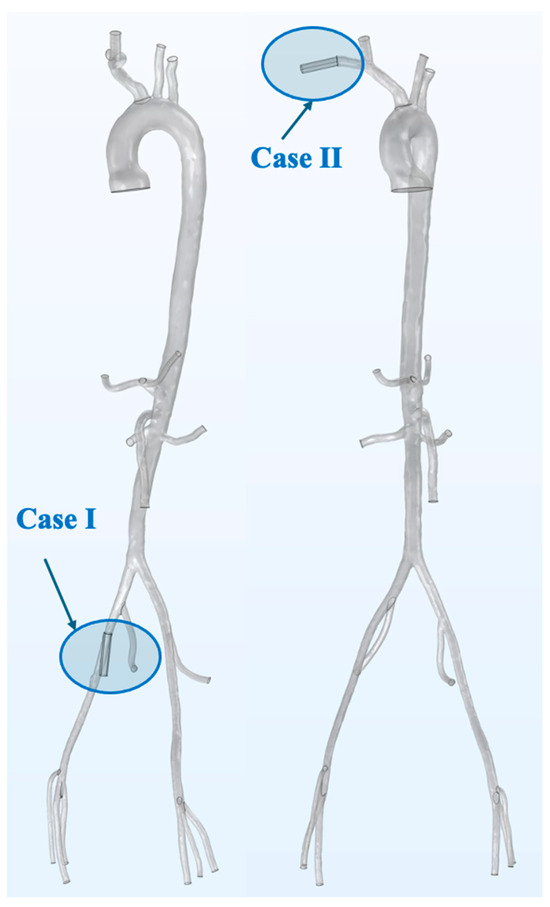 For both cases, we hypothesized that no flow came out from the aortic valve (total support condition: all the blood flow rate in aorta is supplied by ECMO). Thus, the blood was delivered only through the arterial cannula, and the aorta was modeled with a zero-velocity input. To give information on aortic hemodynamics in the presence of left ventricular flow, in addition to the flow rate in the cannula, we performed an additional simulation. More specifically, for both cases (Case I femoral site and Case II subclavian site), the conditions were as follows: