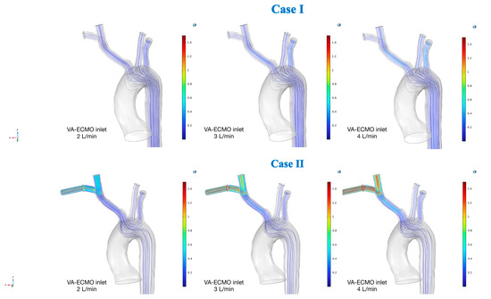 More specifically, the velocity field in terms of streamlines in epiaortic vessels (superior trunk) for the case I and II and for the three values of VA-ECMO cannula inlet flow rate (2.00/3.00 and 4.00 L/min) are shown in Figure 4. In the upper part of the aorta, the flow is lower in the case of femoral cannulation; in the case of subclavian artery cannulation, the flow towards the upper part of the body increases with the increase in the flow rate. It should be remembered that in the vessel occupied by the cannula there is an additional cannula to provide the correct perfusion.