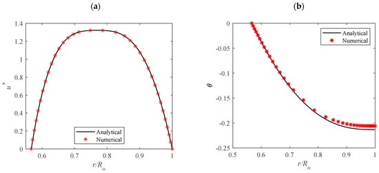 Local thermofluidic features were instead analyzed by comparing the analytical and numerical solutions in terms of the dimensionless velocity and dimensionless temperature profile. Such a comparison is depicted in Figure 6, where the two quantities are plotted against the dimensionless radial coordinate.