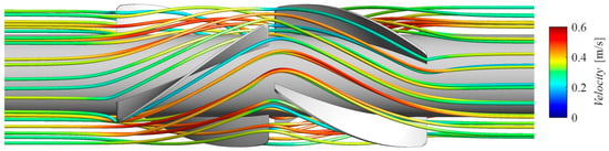 The effects of the newly proposed configuration on the fluid flow were first analyzed. The direction of the fluid flow across the finned module is outlined by the streamlines of Figure 7 for Fluid 1. Here, the presence of helical fins resulted in an induced swirl motion, which was expected to enhance the heat transfer performance according to previous literature works on swirling flow devices [16,17,32,33]. As soon as the twisted fins were interrupted, i.e., in the middle of the finned module, the streamlines drastically changed direction. Note that the fin interruption promoted fluid flow bifurcation, which could beneficially affect the overall boundary layer disruption and product thermalization. On one hand, the fluid followed longer paths, which resulted in increased residence time in the DPHE module with respect to the continuous helical fins. On the other hand, the same portion of fluid was forced to rearrange its radial position, which improved, at least to some extent, the overall mixing.