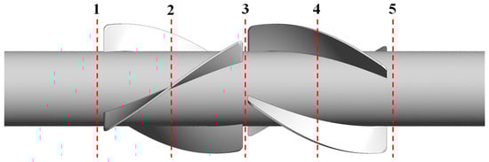In section 1, the fluid started accelerating close to one side of the fins due to an abrupt change in direction, while the opposite side exhibited flow deceleration and partial fluid stagnation. Such an unbalanced velocity distribution, which resulted from inertial effects induced by the fins, was expected to promote boundary layer disruption at the considered section [16]. In sections 2 and 4, the fluid was instead barely circumferentially accelerated, probably due to the deep laminar regime that characterized the studied flow [20]. In fact, the computed velocity contours were better approximated by those obtained through longitudinal fins [22,34], which confirmed the occurrence of dominant axial flows over the secondary ones. This could lead to poorer heat transfer augmentation guaranteed by the sole helical fins due to the low generalized Reynolds numbers considered in the present work (in agreement with [35]), underlining the importance of introducing additional flow disturbance by fin interruption. In section 3, the velocity contour highlighted the highest non-uniformity. As also observed in Figure 7, the fluid abruptly inverted its direction due to the presence of an interrupted staggered fins configuration. Moreover, the relative positioning of the fins resulted in an alternation of high- and low-velocity areas, which reflected the sudden reduction in the flow section within the fins and stagnation points at the fin edges. The velocity contours of sections 4 and 5 presented similar patterns to those of sections 2 and 1, respectively, although they locally varied due to obvious geometrical reasons. From the fields provided, it is interesting to note that the maximum velocity did not substantially vary along the module, which suggests limited pressure drops introduced by the fins.