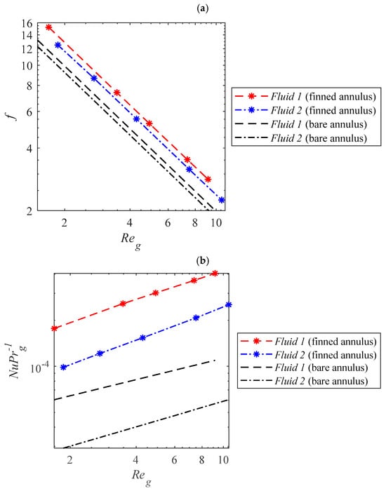 The performance augmentation achieved through the novel finned DPHE module was finally assessed by reporting the main dimensionless quantities that defined the inner thermo-fluid dynamics, such as the friction factor and the Nusselt number, for the two fluids of interest. As mentioned in Section 2, the finned DPHE module was studied at different values of the generalized Reynolds number. In Figure 12, the friction factor (Figure 12a) and Nusselt number (Figure 12b) in the NuPrg−1 form are shown (Prg: generalized Prandtl number). To underline the performance augmentation achieved through fins, the results referred to the bare annulus were analytically computed from the definitions of Section 2.2 and included in the presented graphs. Specifically, the used formulation for the generalized Prandtl number reflected the one adopted in [39]: