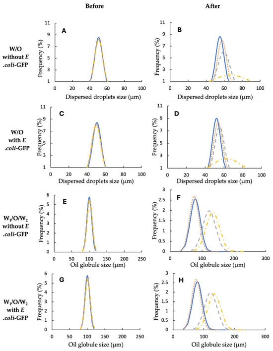 Droplet size distribution for single W/O (A–D) and double W1/O/W2 (E–H) emulsions at 25°C (—), 5°C (····), −20°C (----), and −80°C (- · -) before and after 24 h of storage. Droplet size measurements were taken after the samples were allowed to reach 25 °C following storage at cold temperatures.
