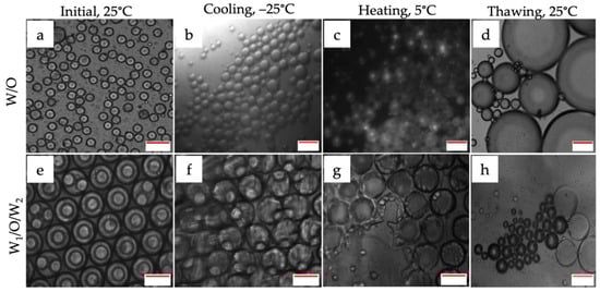 Photomicrographs of W/O (a–d) and W1/O/W2 (e–h) emulsion droplets with change in temperature. The cooling and thawing processes were conducted on the temperature-controlled microscope stage. Scale bar represents 100 µm.