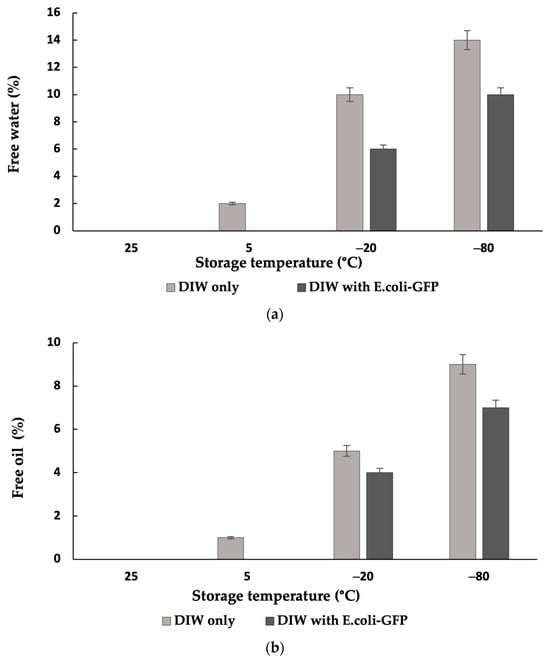 Droplet destabilisation of W/O droplets resulted in the presence of a free water layer due to droplet coalescence, while the destabilisation of W1/O/W2 droplets led to the presence of a free oil layer due to the external coalescence between the inner and outer aqueous phases (forming an O/W emulsion) and coalescence between large oil droplets that resulted in the presence of an oil layer on top of the sample. Figure 3 shows the percentage ratio of free water and oil measured after 24 h of storage with respect to the total emulsion. Given the results obtained, it was determined that phase separation occurred for samples of both single and double emulsions kept at −20 °C and −80 °C, with the highest amount of free water and free oil observed for samples kept at −80 °C. Emulsion stability for samples stored at 25 °C was maintained during the storage period, as there was no observable free water or oil. However, a small percentage of free water and oil (approximately 2%) was observed for samples without E. coli-GFP at 5 °C, and this is mainly attributed to the closely packed water droplets during storage and the absence of E. coli-GFP that helped in improving droplet stability. An overall comparison between samples with or without the presence of E. coli-GFP shows that phase separation was minimised with the presence of E. coli-GFP.