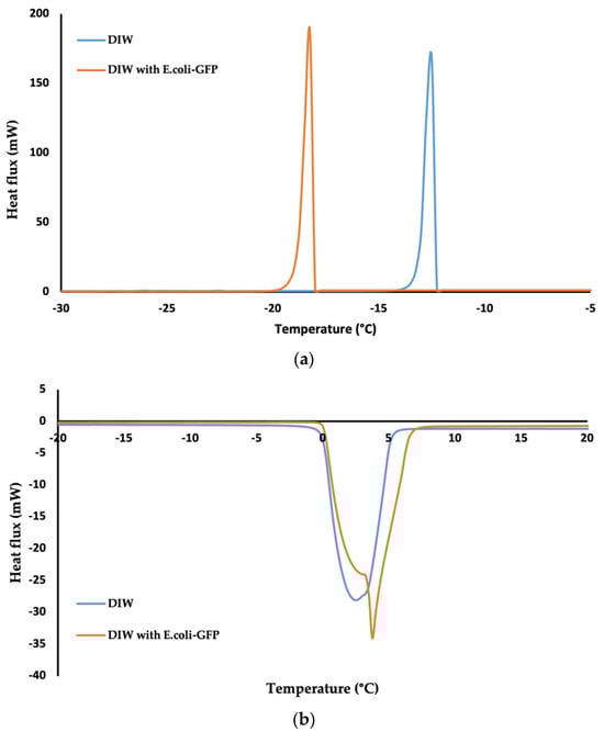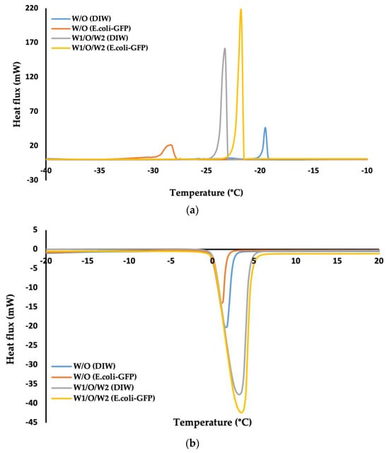 The thermal properties of the bulk aqueous solution (Figure 4) were characterised as opposed to emulsified samples of single and double emulsions in soybean oil (Figure 5). The crystallisation temperature of the samples was determined from the onset temperatures of the crystallisation peaks in which the temperature was recorded at the beginning of the crystallite formation. The onset temperature was determined by using Star e software version 9.0 (Mettler Toledo, Mettler Scientific Instruments, Giessen, Germany). Referring to the crystallisation peaks in Figure 4a, it was determined that the crystallisation of E. coli-GFP suspension in DIW occurred at a lower temperature compared to pure DIW. Pure DIW crystallises at −12 °C and melts at 0 °C, which is around the same temperatures as reported previously in several studies [13,35,50]. For the E. coli-GFP suspension, the crystallisation temperature was recorded at −17 °C, while the melting of the E. coli-GFP suspension occurred around the same temperature as the pure DIW. The reduction in the crystallisation temperature with the presence of E. coli-GFP is due to the freezing point depression, where the presence of E. coli-GFP as a solute tends to lower the freezing point.
