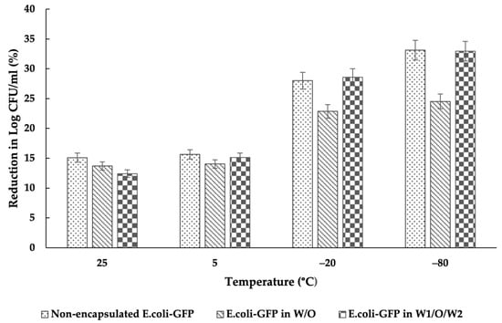 Referring to Figure 6, a large reduction in the E. coli-GFP cell count was observed for samples kept at −20 °C and −80 °C compared to samples kept at 25 °C and 5 °C, whereby, comparing the non-encapsulated samples, a 1.2 log CFU/mL and 1.3 log CFU/mL reduction in viable cell count was observed for samples kept at 25 °C and 5 °C, respectively, while reductions of 2.3 log CFU/mL and 2.7 log CFU/mL were observed for samples kept at −20 °C and −80 °C, respectively. E. coli-GFP encapsulated in W/O droplets showed a smaller percentage of bacterial reduction compared to samples encapsulated in W1/O/W2 droplets and control samples of free E. coli-GFP cells in sterilised DIW.