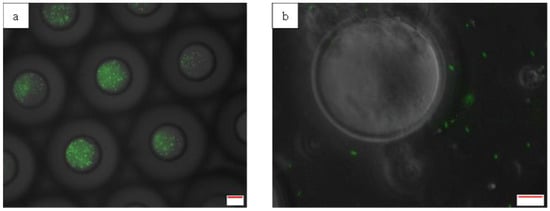 Monodisperse droplets for both single- and double-emulsion droplets were observed for all samples, with or without E. coli-GFP, with a CV value of approximately 9% for single-emulsion droplets and 7% for double-emulsion droplets prior to the storage test, as observed in Figure 1A,C,E,G and Table 1. The results indicate the ability of the flow-focusing microfluidic devices to produce highly monodisperse droplets, and the presence of E. coli-GFP did not affect droplet formation. For samples of single-emulsion droplets, no significant change (p > 0.05) in droplet size was observed after storage at 25 °C and 5 °C (Table 1) for both samples with and without bacteria. The droplets remained monodisperse, with only a 0.1–0.2% change in the value of the coefficient of variation (CV). However, a significant change (p < 0.05) in droplet size and distribution was observed after 24 h of storage for samples stored at freezing temperatures of −20 °C and −80 °C for both samples with and without bacteria. The greatest change was observed for samples stored at −80 °C, where the CV value increased from 9.6% to 28.3% for samples without E. coli-GFP, indicating a polydisperse distribution of droplets (CV values greater than 25% are regarded as polydisperse). Comparing samples with or without E. coli-GFP, the change in droplet stability was minimised in the presence of E. coli-GFP, whereby a smaller change in average droplet size and CV was observed with samples containing E. coli-GFP compared to samples without E. coli-GFP.
