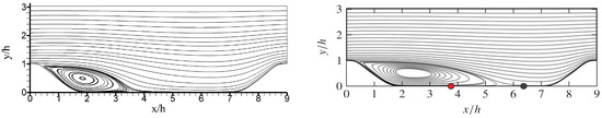 Periodic hill flow velocity streamlines for K. Left: CES results. Reprinted with permission from Ref. [93]. Copyright 2020 AIP Publishing. Right: Corresponding RANS results obtained by Köhler et al. [107]. Reprinted by permission of the American Institute of Aeronautics and Astronautics, Inc. (Pine Brook, NJ, USA). The red dot refers to the experimental measurement of the reattachment point, the black dot refers to the corresponding RANS result.