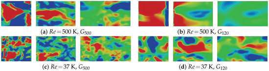 More specifically, the analyses presented in Ref. [93] involved four cases: K (), which is almost fully resolved, K (), which is almost fully modeled, and the transitional cases K () and K (). Here, and refer to the use of grids with 500 K and 120 K grid points, respectively. Corresponding plots of velocity fluctuations are presented in Figure 2. These plots, too, underline the significant difference to steady RANS simulations, where fluctuations are excluded. The almost fully resolved K () case reveals a very good resolution of fine scale structures. It is remarkable to see that grid and variations imply smooth variations in these fluctuation structures, the merging of structures due to a coarser grid or higher . Interestingly, the almost fully modeled K () case still involves strong fluctuations, which are as strong as under resolving conditions. The latter clearly speaks for a stable generation mechanism of fluctuations, which is implied by the derivation of CES methods.