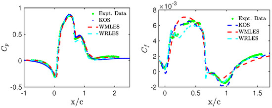Figure 7 also shows pressure coefficient distributions obtained by CES-KOS, WMLES, and WRLES. Based on their sufficient flow resolution ability, CES-KOS and WRLES accurately predict pressure coefficient profiles. In contrast to that, WMLES fails to accurately capture the separation zone characteristics. Both CES-KOS and WRLES reasonably predict the shock location and post-shock pressure recovery. We note that WRLES results agree slightly better with the experimental data downstream of the bump () compared to the CES-KOS model. Skin-friction coefficient distributions obtained by CES-KOS, WMLES, and WRLES are also shown in this figure. We observe that WMLES significantly underestimates the skin-friction coefficient in the separation region and fails to accurately represent the post-separation flow characteristics. The predictions of CES-KOS and WRLES are very similar, although CES-KOS agrees better with the experimental data in the plateau region upstream of separation. Hence, the most accurate flow predictions are provided by CES-KOS.