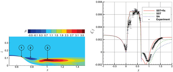 A demonstration of the difficulty of dealing with accurate predictions for this flow in the RANS framework is given by the following. In an attempt to design more generally applicable RANS models, Srivastava et al. [105] recently considered two augmentation strategies, one of them (the reattachment augmentation) focusing on the improvement of predictions for the point of reattachment after smooth-body separation. The modeling approach uses the Spalart–Allmaras (SA) turbulence model [129] in conjunction with an adjustable parameter that modifies the production term. The motivation is illustrated in terms of Figure 5. The left-hand side shows the distribution obtained from an FIML method. Three regions can be seen: region 1 with , region 2 with , and region 3 with . The focus is on region 3, leaving the modeling of regions 1 and 2 for future work. A very essential fact is that there is no use of ML in this approach, but an analytical model is provided for . The latter includes a parameter which roughly correlates to region 3. The authors then apply a smoothed version of the expression if and otherwise. Here, the constants and are applied. A characteristic skin-friction result result is also provided in Figure 5 (SST + fix refers to the enhanced RANS model). It may be seen that this approach leads to improvements but significant model deficiencies remain; see the comparison with Figure 4.