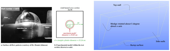 The experimental configuration and the computational domain of the axisymmetric transonic bump considered by Bachalo and Johnson [130,131], along with the applied boundary conditions is illustrated in Figure 6. This case pertains to shock-triggered boundary layer separation induced by an axially symmetric bump mounted on a slim spherical cylinder, which extends 61cm upstream. The case reflects the upper surface of a transonic wing. It is characterized by a Mach number () of and a Reynolds number () of M relative to the airfoil’s chord length c.