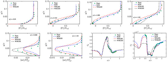 Streamwise velocity profiles obtained by CES-KOS, WMLES [132], and WRLES [133] are shown in the first row of Figure 7. The CES-KOS model predicts the streamwise velocity more accurately than WMLES and WRLES. In regard to turbulent shear stress profiles shown in the second row, we see a reasonable agreement of WMLES, WRLES, and CES-KOS with experimental data. Interestingly, CES-KOS and WRLES provide very similar results. In attached flow regions, WMLES overpredicts the turbulent shear stress. Due to its delayed reattachment point, WMLES predicts a faster separated shear layer growth and a higher maximum Reynolds stresses compared to CES-KOS. These observations are fully in line with past numerical studies using alternative models [134].