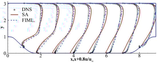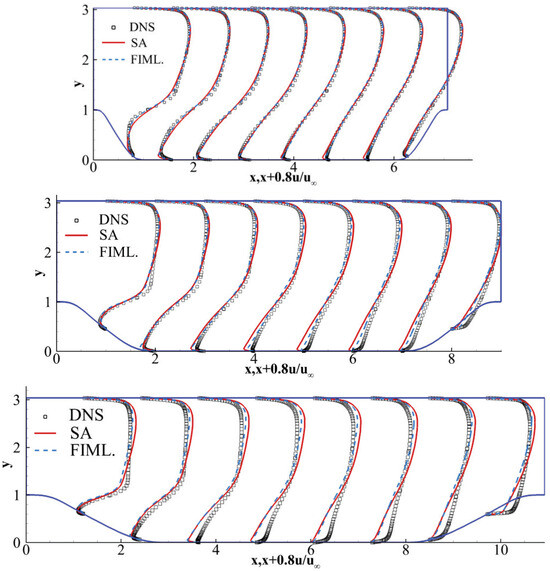 The effect of an increased is shown in Figure 10: the model is applied to the case in conjunction with instead of the case considered so far. The FIML model obviously improves RANS predictions. Its performance is acceptable, although the FIML predictions are not highly accurate. The acceptable model performance may be related to the fact that the case considered is not too far from the range considered in the model training. The authors state that the results show a certain extent of generalization ability both on different geometry configurations and Reynolds numbers.