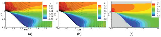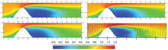 Periodic hill flow results obtained by Yan et al. [3] at , grid effect: streamline velocities at are shown from above to below, respectively. Reprinted with permission from Ref. [3]. Copyright 2018 Elsevier.