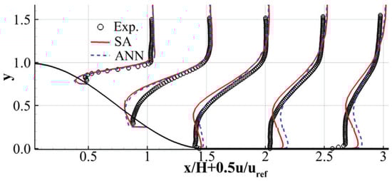Yan et al. [108] report that the effect of the three ANN considered on the pressure coefficient distributions is very similar, which enables us to focus on the ANN1 results. Reference to the term artificial NN (ANN) is made here to provide a direct link to the cited work, bearing in mind that the terms ANN and NN have the same meaning. Characteristic results obtained by Yan et al. [108] for the unseen geometry of the 3D FAITH hill are shown in Figure 11 and Figure 12. Figure 11 shows substantial differences between the flow field structures seen in experiments and using the FIML model, although the ANN-enhanced SA model shortens the separation region compared to the original SA model.