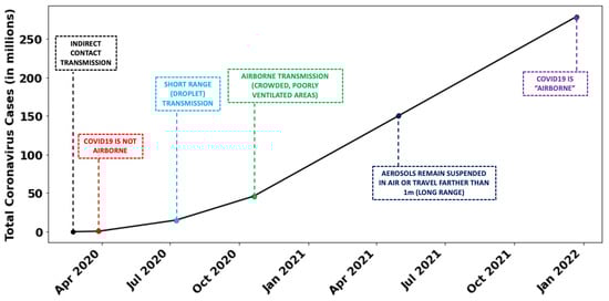 Infectious diseases transmitted via the droplet route are primarily caused by three major pathogen classes: viruses, bacteria, and fungi. The earliest documented airborne contagious disease, measles, caused by the measles virus, was identified in the 9th century [6]. Table 1 provides a chronological overview of airborne diseases and their causative pathogens, spanning from the 9th century to the present day, highlighting the diverse array of airborne pathogens. Airborne diseases have inflicted devastating consequences on global populations. For instance, while World War I resulted in 16 million deaths, the subsequent influenza pandemic caused an estimated 50 million fatalities worldwide [7]. The COVID-19 pandemic, as of 1 June 2024, has affected over 700 million individuals and claimed more than 7 million lives [8]. Despite the World Health Organization (WHO) acknowledging the presence of COVID-19 in December 2019, their official recognition of its airborne transmission was delayed for two years [9]. Figure 1 illustrates the timeline of the pandemic alongside corresponding WHO declarations. Initially, the WHO asserted that COVID-19 transmission occurred solely through direct or indirect contact with infected individuals. A year into the pandemic, with over 1 million deaths globally, the WHO revised its stance, suggesting the possibility of airborne transmission in crowded, poorly ventilated spaces. By the time they acknowledged the potential for droplets to remain airborne for extended periods and travel beyond 1 m, the death toll had surpassed 3 million. On 23 December 2021, after a comprehensive review of case studies and transmission patterns, the WHO officially declared COVID-19 as airborne. By this time, the global death toll had already reached 5.5 million.