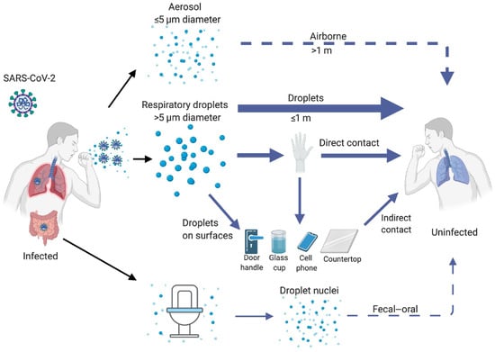 Transmission routes for SARS-CoV-2 virus to travel from an infected source to a susceptible individual [54].