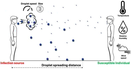 The rate of evaporation of a single aerosol depends on a variety of factors, such as relative humidity, air temperature, and the relative velocity between aerosols and ambient air. It plays an important role in determining the distance traveled by the droplets. Studies have shown that the droplet spreading distance is longer and the aerosolization rate is lower during winter than summer, indicating the importance of weather conditions for airborne transmission [71,72]. Experimental studies indicate that higher temperatures and lower humidities lead to higher evaporation rates, which increase the critical droplet diameter [2,69]. Computational studies support the hypothesis that the evaporation of droplets cannot be ignored while performing simulations to understand airborne transmission [73,74].