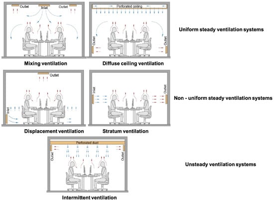 Indoor environments with uniform steady ventilation systems like mixing ventilation [101] and diffuse ceiling ventilation [102] have the highest exposure risk compared to other ventilation systems [103]. It was found that high supply and exhaust pose higher infection risks with uniform steady ventilation systems [104,105]. These studies correct the ideology that a higher ventilation rate does not guarantee better mitigation of infection spread [104,106]. Non-uniform steady ventilation systems such as displacement ventilation [101] and stratum ventilation [107] show minimal contamination levels [108,109,110,111] when compared to mixing ventilation and diffuse ceiling ventilation. Unsteady ventilation systems seem to be less effective than uniform steady air systems due to periodic on/off cycles in the air supply, as the concentration of contaminants increases when the air supply is off [112].