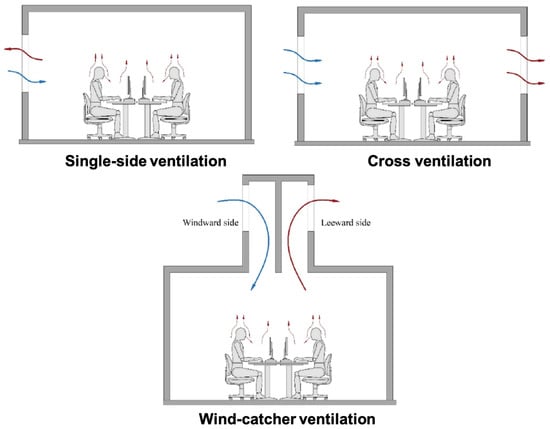 Indoor air quality (IAQ) and thermal comfort can also be enhanced by introducing fresh air through windows, doors, and other openings. Natural ventilation, a passive strategy utilizing natural airflow, can provide outdoor air in moderate climates and mitigate airborne transmission. Common wind-driven natural ventilation strategies include single-side, cross, and wind-catcher ventilation, as illustrated in Figure 5. Many numerical and experimental studies have been carried out inside classrooms, office rooms, buses, etc., to study the efficacy of each of these strategies. Some studies have compared these strategies with other natural ventilation systems and/or with mechanical ventilation systems [88]. Cross ventilation, achieved through dual-side windows, generally outperforms single-side ventilation [113,114]. However, in specialized facilities like hospitals, not all natural ventilation systems meet stringent clinical standards [115,116]. Research suggests that simple architectural modifications, such as optimization of window placement and size, can significantly improve contaminant removal through natural ventilation [117,118]. However, this approach may be limited in areas with insufficient wind to achieve the required ventilation rate, highlighting the fact that the efficacy of natural ventilation systems cannot be guaranteed at all times.