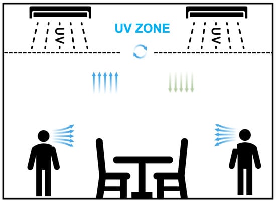 Upper-room Ultraviolet Germicidal Irradiation (UR-UVGI) technology utilizes shielded UV lamps suspended from the ceiling of populated spaces, as shown in Figure 6, to create an irradiation field above occupants, effectively inactivating airborne pathogens [154,155]. This approach takes advantage of natural convection currents to transport airborne microorganisms through the UV field, enabling the rapid disinfection of large air volumes. The effectiveness of this system in disinfecting large volumes of air depends heavily on the fluid dynamics within the room, making airflow patterns crucial in the design and operation of UR-UVGI systems. The efficacy of this technology in inactivating viruses such as chickenpox and measles in school settings was first demonstrated by Wells [156]. Subsequent experimental studies in isolation wards, commercial spaces, and residential areas have confirmed its effectiveness [157,158,159]. Computational fluid dynamics (CFD) studies [160,161,162] on naturally or mechanically ventilated hospital wards and test chambers have further demonstrated the efficiency of UR-UVGI by integrating air mixing, UV fields, and microbial degradation. These studies have also led to the development of mathematical models [163,164] to assess airborne contamination in rooms equipped with ceiling-mounted UVGI technology. Research aimed at enhancing the effectiveness of UR-UVGI has explored various strategies, including the use of ceiling fans, optimization of UV lamp placement, adjustments to room ventilation rates, modifications to ceiling height, and variations in UV lamp power [162,165,166,167]. The effectiveness of UR-UVGI diminishes with higher air exchange rates, as this reduces microbial exposure to the UV lamps. Rooms with higher ceilings and UR-UVGI systems have been shown to contain lower levels of contaminants compared to rooms with lower ceilings. Additionally, while 254 nm UV lamps are commonly used, 222 nm UV-C radiation has also demonstrated a high rate of pathogen inactivation. The combination of low-speed ceiling fans and UR-UVGI has proven more effective than the absence of fans. As research continues, new approaches and innovations are emerging to further enhance the efficiency of this mitigation solution [168,169].