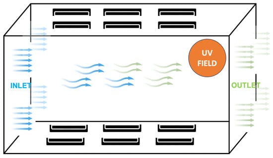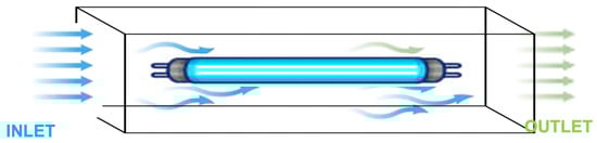 UV radiation can be integrated into HVAC systems by installing an array of UV lamps within the ventilation ducts as shown in Figure 7, where a high-intensity UV field is generated to effectively inactivate pathogen-laden particles entering the system. These HVAC systems are carefully designed to confine UV exposure to within the ducts, ensuring the safety of occupants while also disinfecting surfaces within the HVAC components. Although this approach may consume more electrical power compared to standard HVAC systems, it significantly enhances the inactivation of airborne pathogens. Additionally, proper shielding is essential to limit UV irradiation to the ducts, preventing any exposure to occupants. Experimental studies such as in ICU settings and car HVAC systems [170,171,172] have demonstrated improved air quality through the application of UVGI in ducts. Computational studies [173,174,175] have also simulated various UV lamp configurations and air velocities within ducts to evaluate their impact on inactivation rates. Both experimental and numerical findings suggest that factors such as lamp placement within the duct, duct length (from inlet to outlet), and chamber size play critical roles in determining the effectiveness of microbial inactivation.