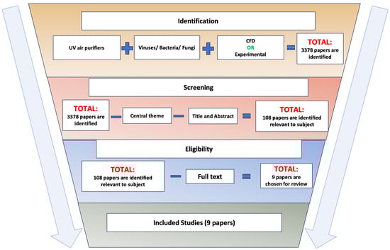 Another application of UV radiation for airborne pathogen disinfection is the use of a portable air cleaner with UV air purification technology. As mentioned earlier, limited research is available on the performance of UV-based PAC technology. Therefore, an analytical review of the available UV-C radiation-based PACs in the industry, along with peer-reviewed computational and experimental studies, was conducted to assess their effectiveness and efficacy as a mitigation solution. A set of selection criteria used in several published peer-reviewed articles [85,88,179,180] involves following the four phases of a systemic review [85,181]: (1) identification, (2) screening, (3) eligibility, and (4) inclusion of studies for the review. To perform this review, Google Scholar, PubMed, and Web of Science were used as search engines to collect a list of studies conducted over time. These collected papers were then subjected to multiple steps of scrutiny to retrieve the relevant papers for this study. A flow chart was designed, as illustrated below, to explain the methodology used to perform this review (Figure 8). Using all the keywords illustrated in the flow chart, a total of 3378 papers were collected and. Then, an elimination process was conducted, comprising the elimination of papers beyond the scope of the review by reading the title and keywords. Later, by reading their abstracts, partially skimming their methodologies, etc., the set was reduced to 108 papers. Finally, after an in-depth review, nine papers were chosen for this study. The aim of this review was to compile only scientific articles on UV air purifiers, examining their potential as mitigation solutions by evaluating either experimental or computational results that qualitatively and quantitatively demonstrate their efficacy and effectiveness in real-life scenarios.