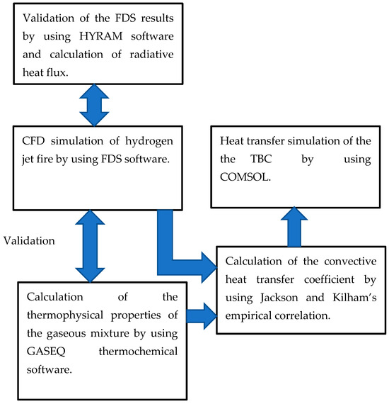 This computational method includes several aspects of hydrogen jet flame accidents and their mitigation: the CFD simulation of hydrogen jet flames using the HyRAM code and Fire Dynamics Simulator (FDS) software using a large eddy simulation (LES) turbulence model; the calculation of the gaseous mixture’s thermo-physical properties using GASEQ thermochemical code; the calculation of convective and radiative heat fluxes by using empirical correlation and HyRAM software. To the best of my knowledge, it is the first time that the HyRAM is applied for the calculation of radiative heat flux for the design of the TBC. The heat transfer simulation on the pipe thermal barrier coating (TBC) was performed by using COMSOL Multiphysics software during the heating phase. This method is shown schematically in Figure 1.