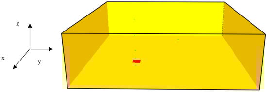 The red square located at the bottom of the computational model represents the hydrogen injection point. The green points represent the thermal monitor sensors. The height of the computational domain is 3.0 m. The width and the length of the computational domain are 10 m. At the bottom side of the computational domain, hydrogen was injected and ignited (in coordinates x = y = 3.1 m and z = 0). Five thermal monitor sensors were placed inside the computational domain. Table 1 shows the thermal monitor sensors locations inside this domain. It is assumed that the conditions on the flame impingement on a flat wall can be used to approximate the conditions on a cylindrical surface.