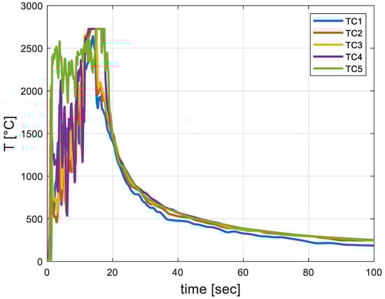 Figure 7 shows that the hot gaseous mixture’s maximal velocity was about 5.05 m/s. Figure 8 provides the transient thermal response of the five thermal monitor sensors (TC1–TC5) and shows that there has been a sharp decrease in temperature readings at about 15 s.