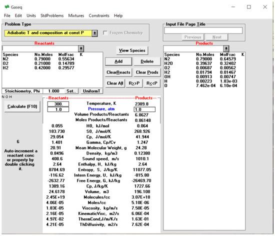 GASEQ software was designed to perform thermodynamic calculations related to chemical equilibrium in gas–phase reactions. It is commonly used in fields such as combustion, atmospheric science, and chemical engineering [25]. It is frequently used to analyze combustion processes, including determining combustion products and calculating flame temperatures. It can calculate a gas mixture’s equilibrium composition given a set of initial conditions, such as temperature, pressure, and the amount of each species. It determines a mixture’s thermodynamic properties, such as enthalpy, entropy, and heat capacity [25]. The combustion product mixture’s composition and the thermo-physical properties and composition are provided in Figure 9.