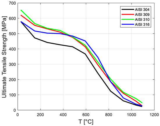 Plot of ultimate tensile strengths of several stainless steels shown as a function of temperature (thermomechanical data are from [28]).